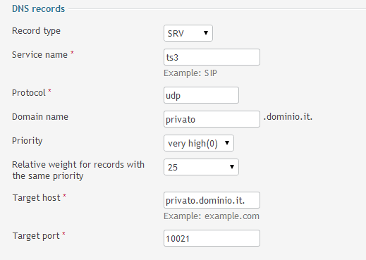 Ovvero: ts3.dominio.it (se un utente scrive ts3.dominio.it:10021 non si connette)