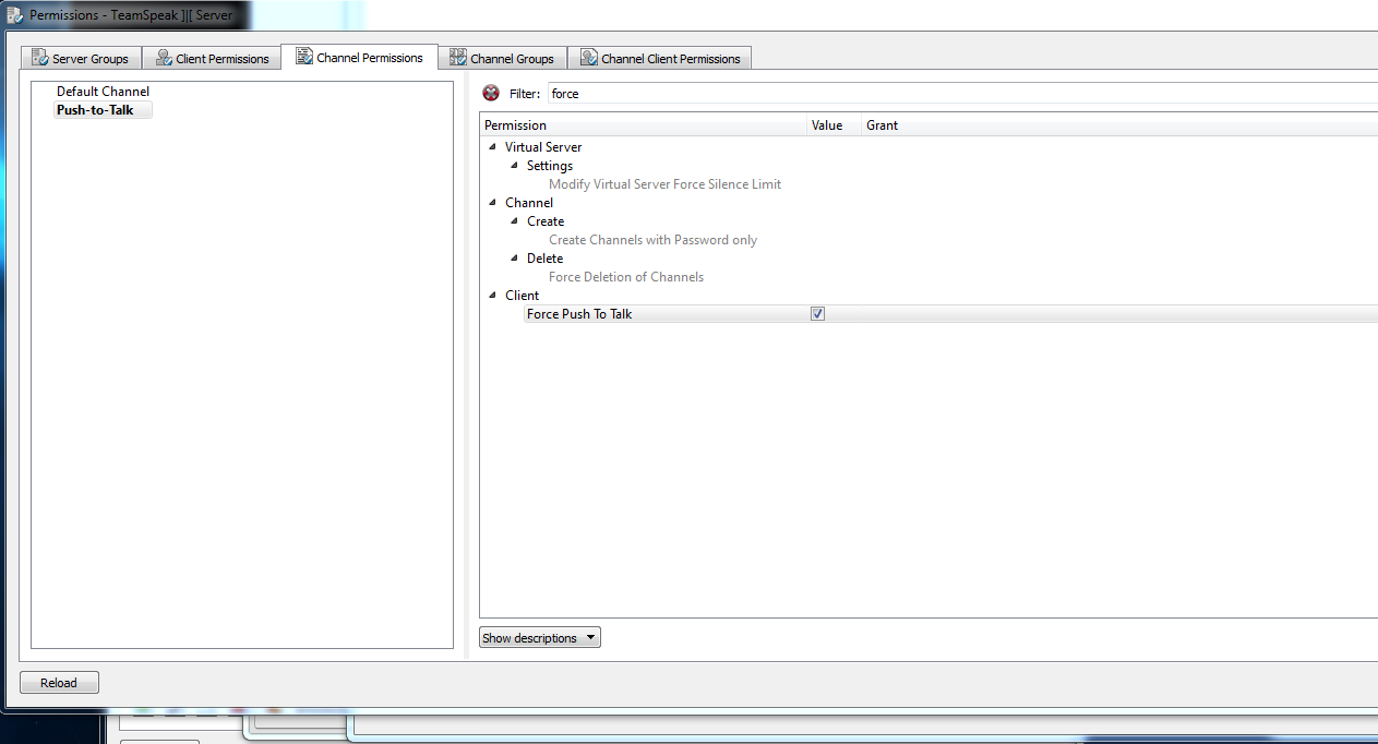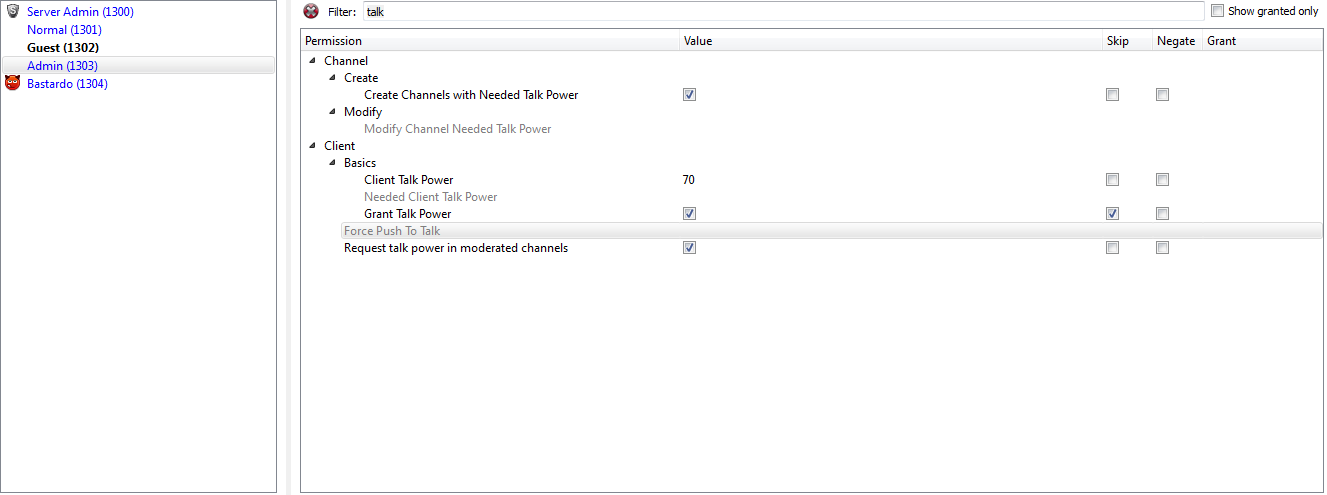 lo skip evita che il permesso si imponga sullo stesso permesso dei gruppi canale a cui appartiene. Il force-ptt impostato dal gruppo server con lo skip mi fa strano che sia influenzato da quello del gruppo canale che già di suo non ha il value a true (come dire "evita un blocco che già non hai"). Dovrò provare questa cosa.