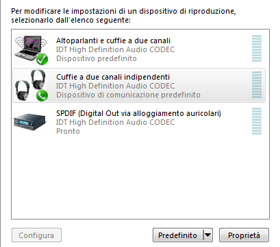 Il grosso problema è che non riesco a settare come predefinito soltanto le cuffie, vado sul tasto dispositivo predefinito ma dopo aver cliccato non avviene alcun cambiamento, rimane la spunta verde su altoparlanti e il telefono su cuffie.