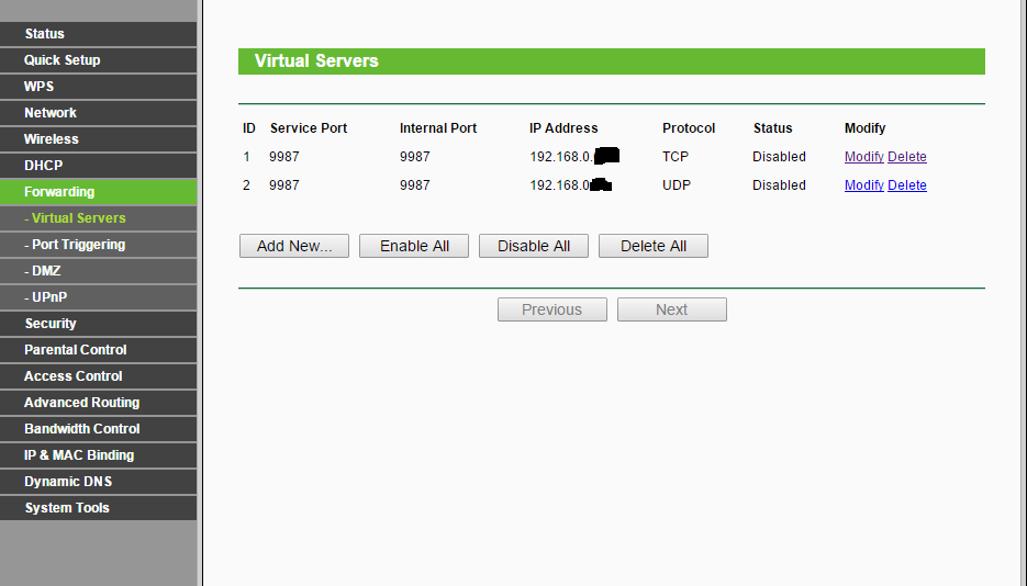 Prima sono andato su 192.168.0.1, dopo su Forwarding,e poi su Virtual Servers e li ho messo il mio ip cioè 192.168.0.**(L'ho messo come ip statico) e la posta 9987 TCP e pure UDP poi ho avviato il file .exe ho messo privilege key e dopo sono andato su www.ilmioip.it e gl'ho dato il mio ip 176.65.80.1**:9987,però ancora non si riescono a connettere!!!