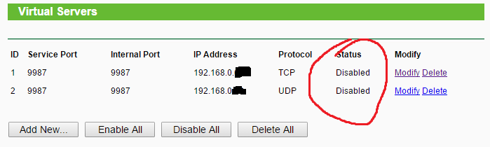 La prima cosa che salta all'occhio è lo status "disabled" delle due configurazioni, la seconda il provider poco comune che usi: permette di aprire porte e hostare? Specialmente gli ips satellitari o tramite parabola non consentono queste cose (vedi eolo con i contratti meno recenti o linkem) per via degli ip "privati" (nattati) che forniscono.